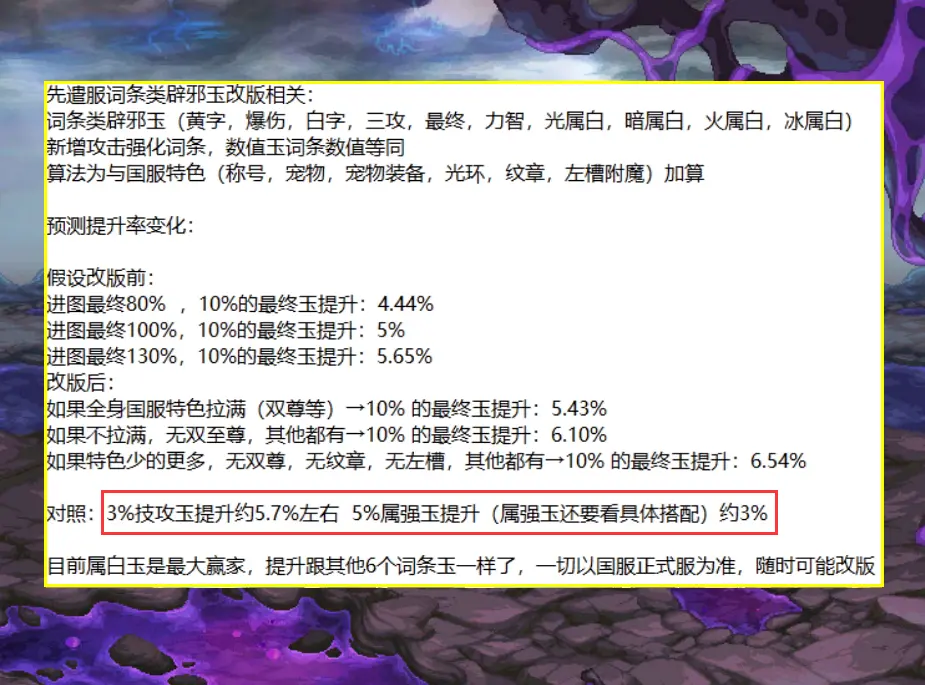最后来分析一下110级的“技攻”和“属强”,前者依旧强无敌!3%技攻玉能提升5.7%,所以“玉玺”仍是No1选择,至于“属强玉”的提升率大约是3%,数据来源于旭旭宝宝5.13的直播,当然属强玉的提升率要看105史诗的搭配。其实110级哪种辟邪玉更强看商人就行了……商人囤什么,那什么玉就强!