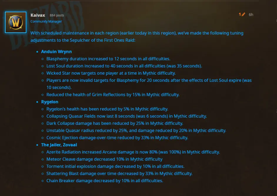 ●在史诗难度下,艾泽里特辐射造成的奥术易伤由100%降低至80%。